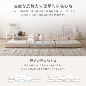 このマットレスは、プロファイルウレタンと高反発ウレタンを採用し、厚さ約10cmのボリューム感で、身体を点で支えながら朝まで快適な眠りを叶えます。適度な反発力で理想の寝姿勢を保ち、体圧を分散することで肩や腰への負担をやわらげます。理想の寝姿勢とされる「立っているときのS字カーブ」を再現し、自然な寝心地へ導いてくれるのが特長です。