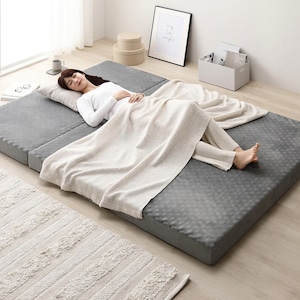 三つ折り仕様のため、コンパクトに収納でき、持ち運びもラク。立てておけば湿気対策にもなり、使わないときはデッドスペースにすっきり収まります。連結テープが付属しているので複数枚をつなげて使うこともでき、ズレを防いで見た目もフラットに整います。