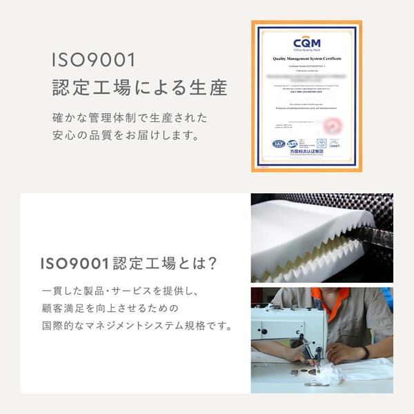 品質にもこだわり、ISO9001認定工場で生産。国際規格に基づく管理体制で、安心できる製品をお届けします。カラーはグレーとベージュの2色展開で、インテリアにもなじみやすく、ライフスタイルに合わせて多彩な使い方ができるマットレスです。