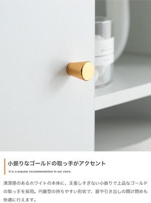 天板の大理石柄とゴールドのあしらいが特徴なキャビネット。大人かわいいデザインの本体とスタイリッシュなゴールド脚付きで、置くだけでお部屋の雰囲気を高めてくれます。3つの収納スペースと背面のケーブル穴で、ごちゃつきがちな雑貨や雑誌、LANケーブル類などもスマートに整理でき、生活感がなく美しい空間を実現可能です。また奥行は約34.4cmとスリム設計のため、一人暮らしやワンルームなど限られたスペースにもすっきり置いていただけます。