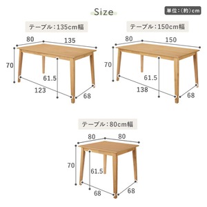テーブルは3サイズ展開。コンパクトな80cm幅は1〜2人にぴったり、135cm幅は4人で快適に使えるバランスの良いサイズ、そして150cm幅は広々と使いたい方におすすめです。しっかりとしたボリューム感のある脚は安定感があり、ダイニングテーブルとしてだけでなくデスクや作業台としても活躍します。さらに木部にはウレタン塗装を施し、水や熱に強くお手入れも簡単。小さなお子様がいるご家庭でも安心してお使いいただけます。