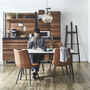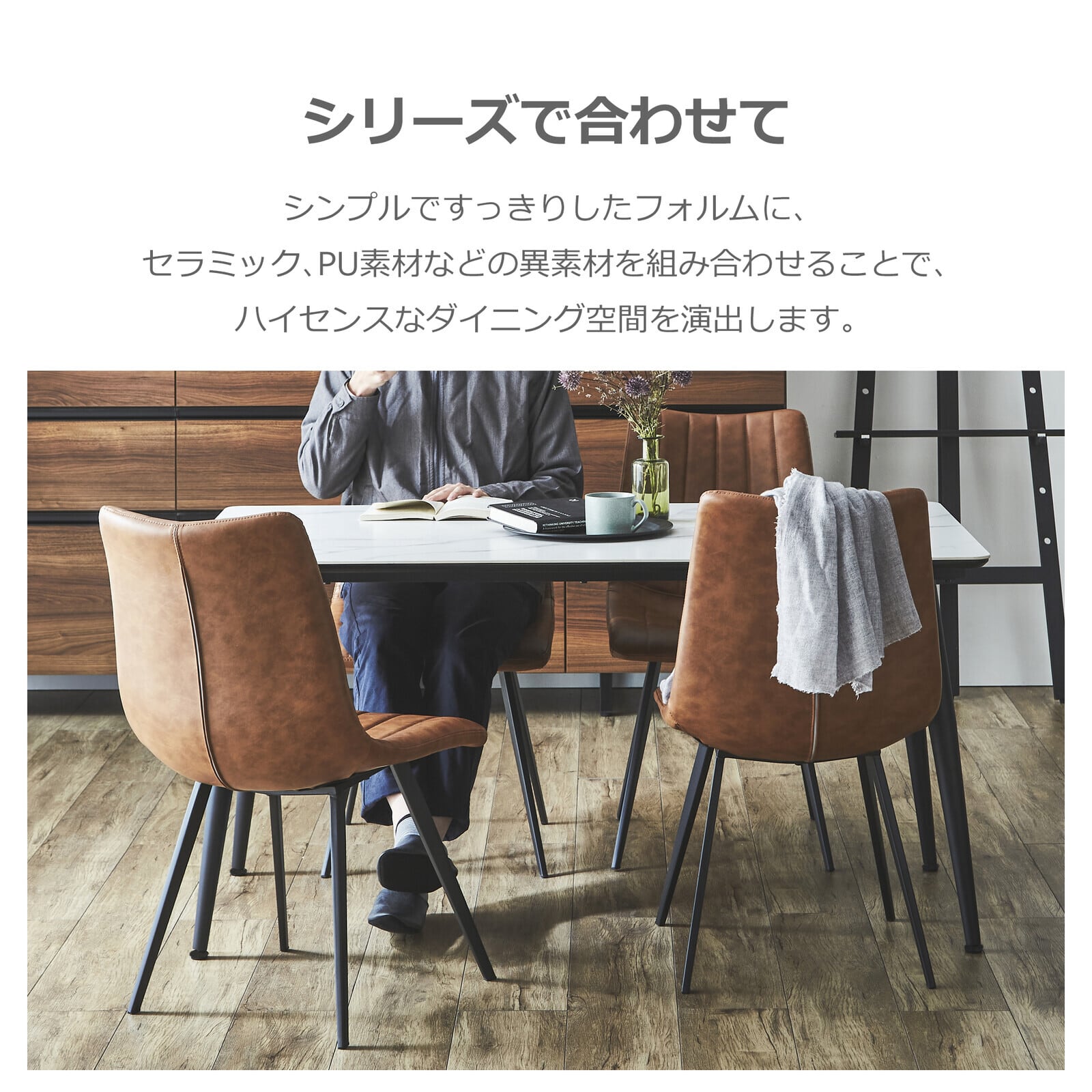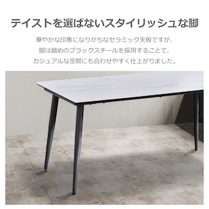 華やかな印象になりがちなセラミック天板ですが、脚は細めのブラックスチールを採用することで、カジュアルな空間にも合わせやすく仕上がりました。