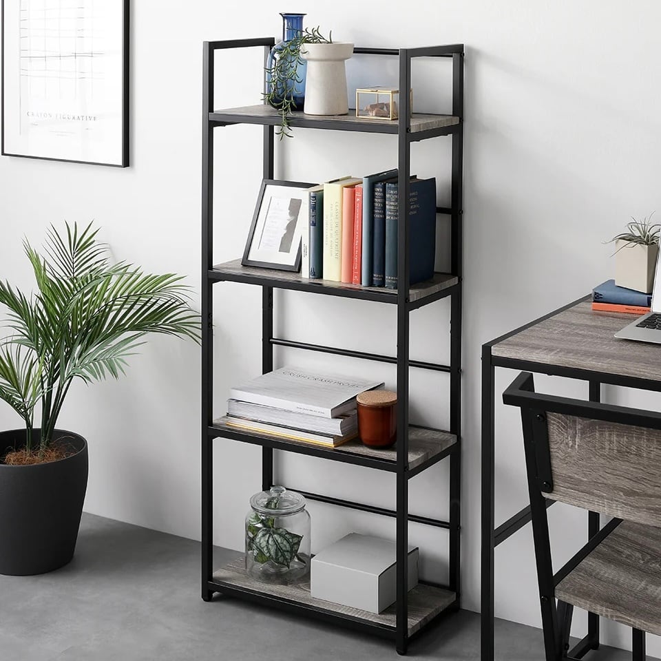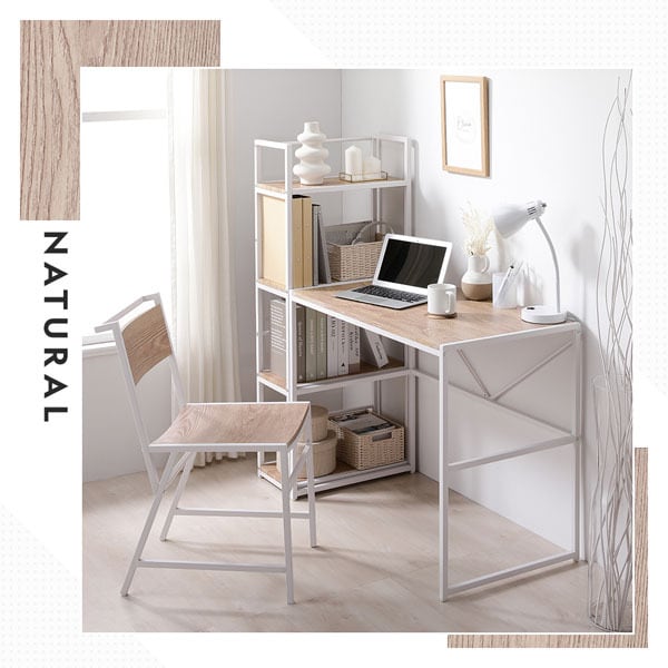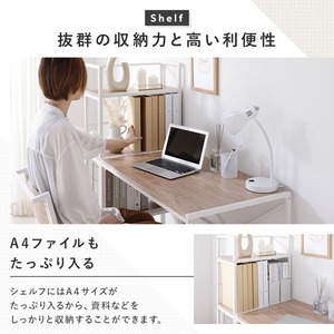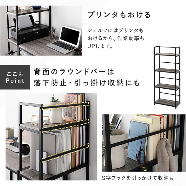 収納力と利便性にも優れており、シェルフにはA4サイズのファイルをたっぷり収納できるため、書類や資料をすっきり整理できます。さらにプリンターも置ける設計で、作業効率の向上にもつながります。背面にはラウンドバーを備え、収納物の落下を防ぐだけでなく、S字フックを使った引っ掛け収納にも対応しています。