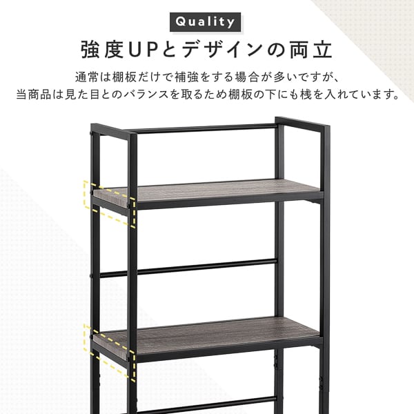 強度面にも配慮し、通常は棚板のみで行われがちな補強を、棚板下の桟によって強化。見た目とのバランスを保ちながら、しっかりとした安定感を確保しました。