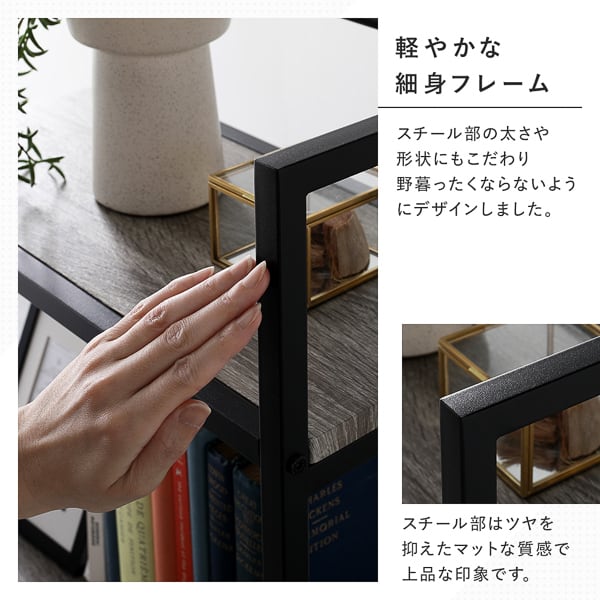 デザインには、木目柄とスチールを組み合わせた異素材MIXを採用。本物の木のような質感を再現した木目柄と、ツヤを抑えたマットなスチールが調和し、落ち着きのある上品な印象を演出します。スチールフレームは細身で軽やかなデザインに仕上げ、太さや形状にもこだわることで、野暮ったさのない洗練されたフォルムを実現しました。