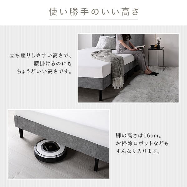 高さは立ち座りしやすく、腰掛けるのにもちょうど良い設計です。脚の高さは約16cmあり、お掃除ロボットもスムーズに通れるため、日々のお手入れも快適に行えます。床板には通気性に優れたすのこを採用し、湿気がこもりにくく、寝具を清潔に保てるのも嬉しいポイントです。