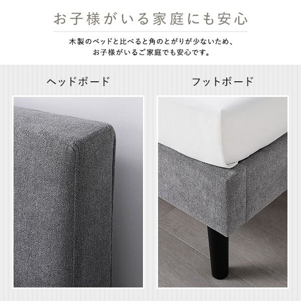 生地には、ソファにも使われるような高級感のあるファブリックを採用しました。やわらかく肌触りがよいため、触れるたびに上質さを実感していただけます。また、木製ベッドに比べて角のとがりが少ないため、小さなお子様がいるご家庭でも安心してお使いいただけます。