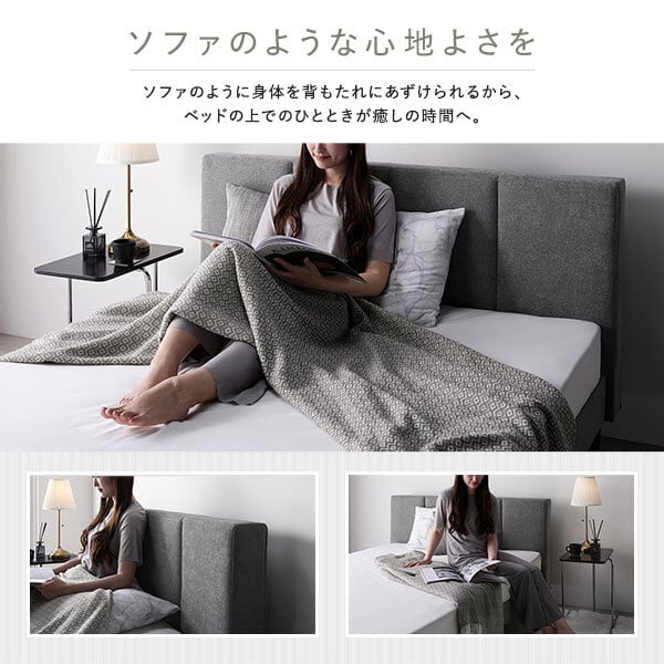 デザインは、シンプルな縦キルトとすっきりとした脚を組み合わせたスタイリッシュなフォルム。圧迫感を与えにくく、抜け感のあるデザインが空間を美しく整えます。背もたれに身体をあずけられる設計のため、ベッドの上でくつろぐ時間も、ソファに座っているかのような心地よさを感じられます。