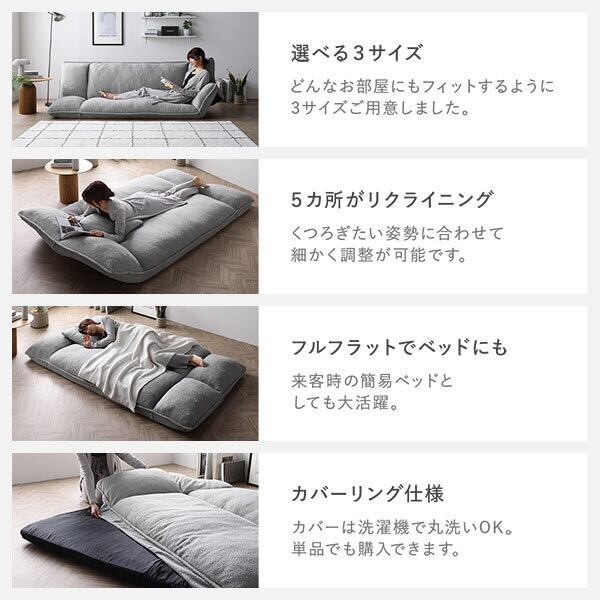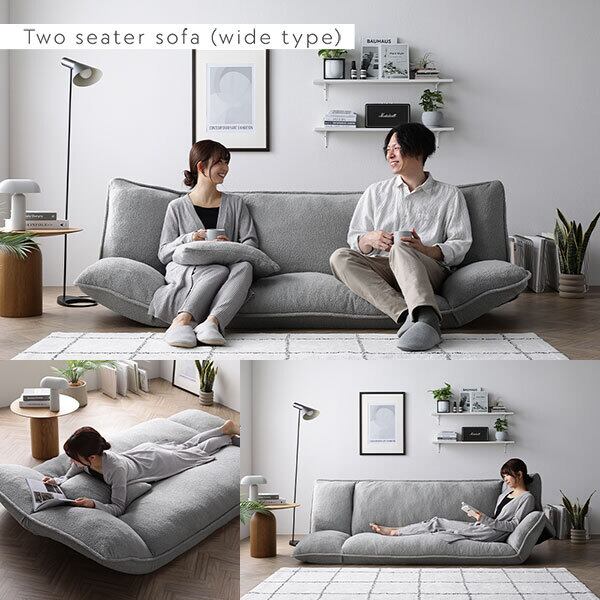 どんなお部屋やライフスタイルにもフィットするよう、こちらのソファは選べる3サイズをご用意しました。1人掛け、2人掛け、2人掛けワイドから選べるため、一人暮らしのお部屋から家族でくつろぐ空間まで幅広く対応します。さらに、背もたれ・両肩・両肘の5カ所がリクライニングする設計で、くつろぎたい姿勢に合わせて細かく調整が可能です。背もたれは全サイズ共通で42段階、両肩・両肘はサイズに応じて6〜14段階まで調整でき、まさにどんな体勢にもジャストフィットします。