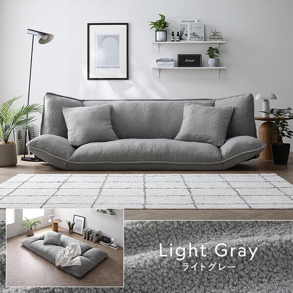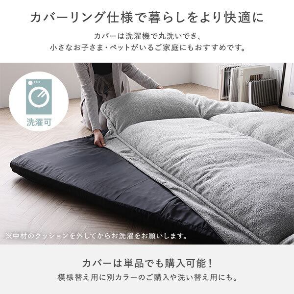 カバーは取り外し可能なカバーリング仕様で、洗濯機で丸洗いできるため、いつでも清潔に保てます。小さなお子さまやペットのいるご家庭にもおすすめで、カバーは単品購入も可能です。素材には、モコモコとした表情が魅力のブークレ生地を使用し、柔らかくお洒落な雰囲気を演出。背面まで表と同じ生地を使用しているため、後ろ姿も美しく、お部屋の中央に置いても統一感のある佇まいです。