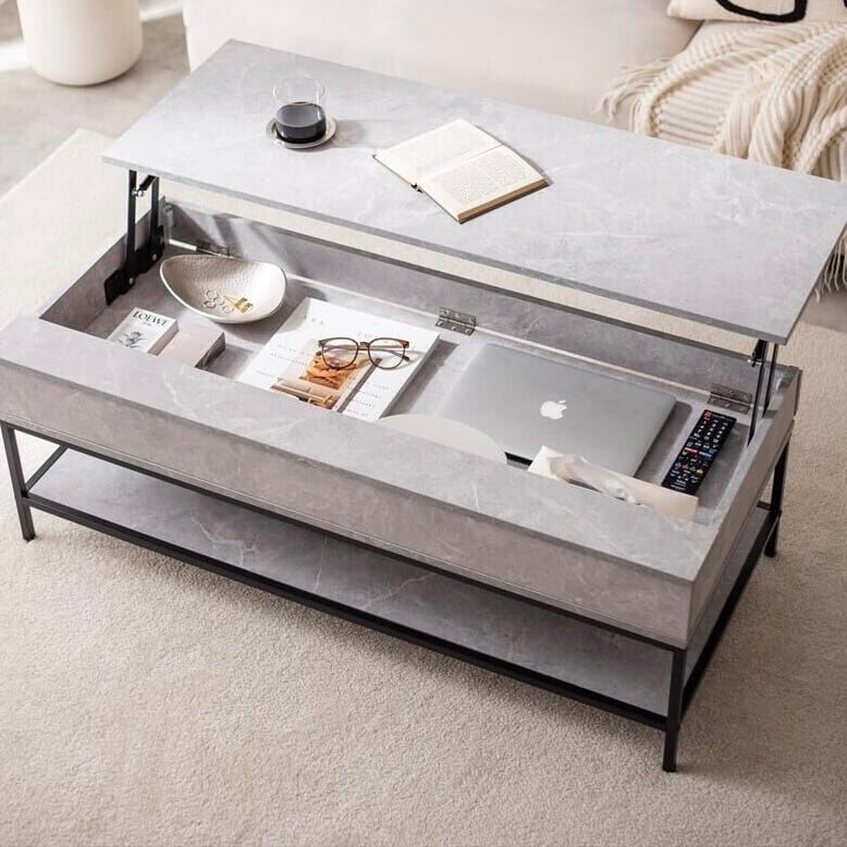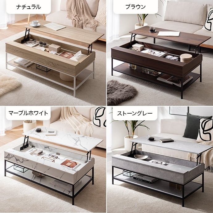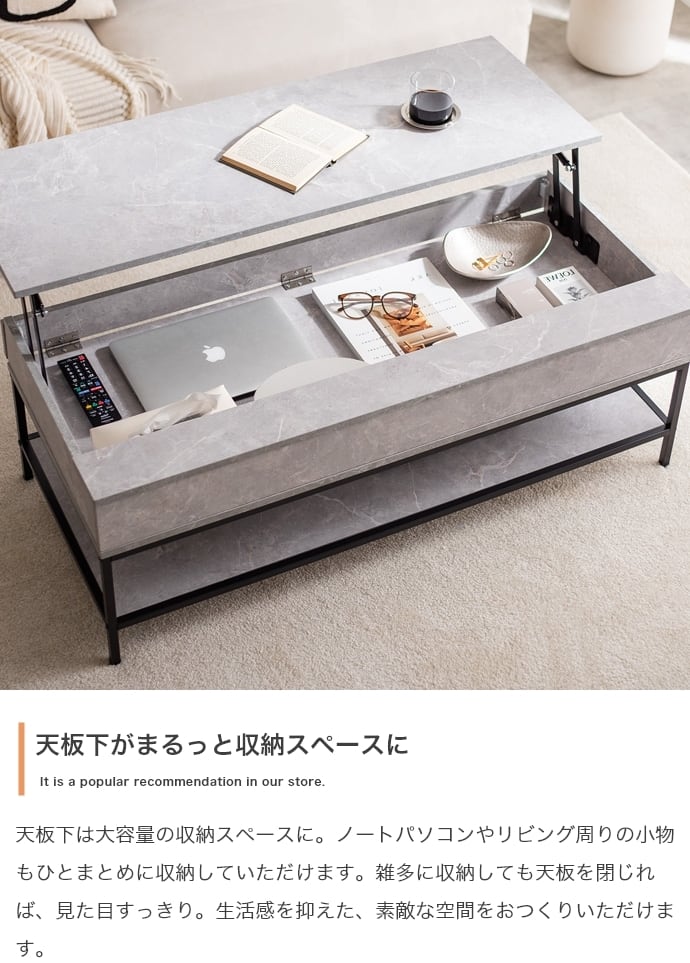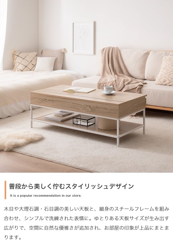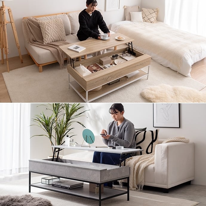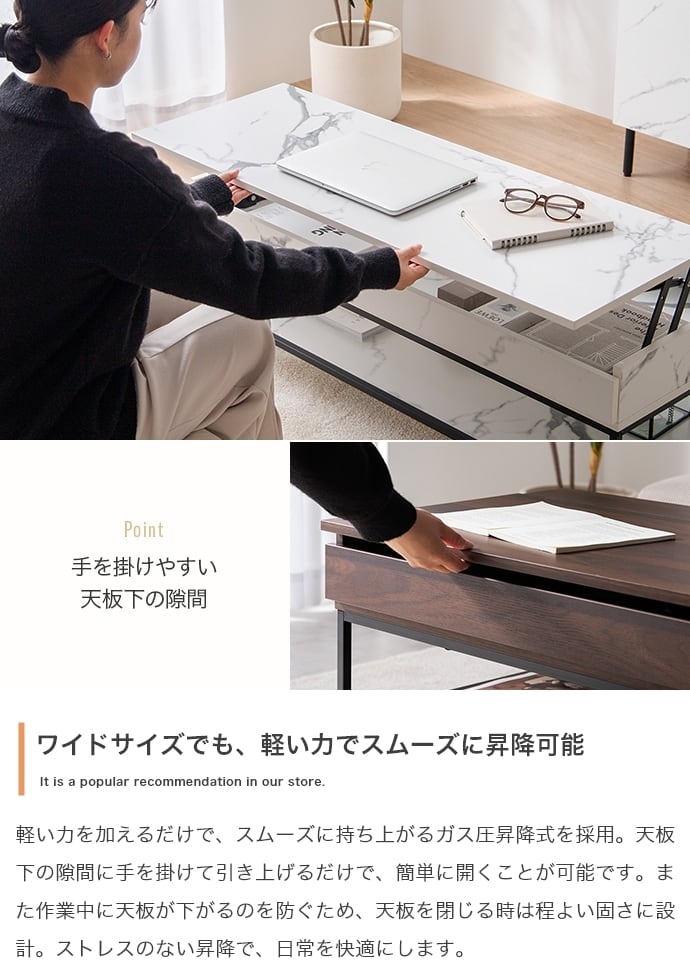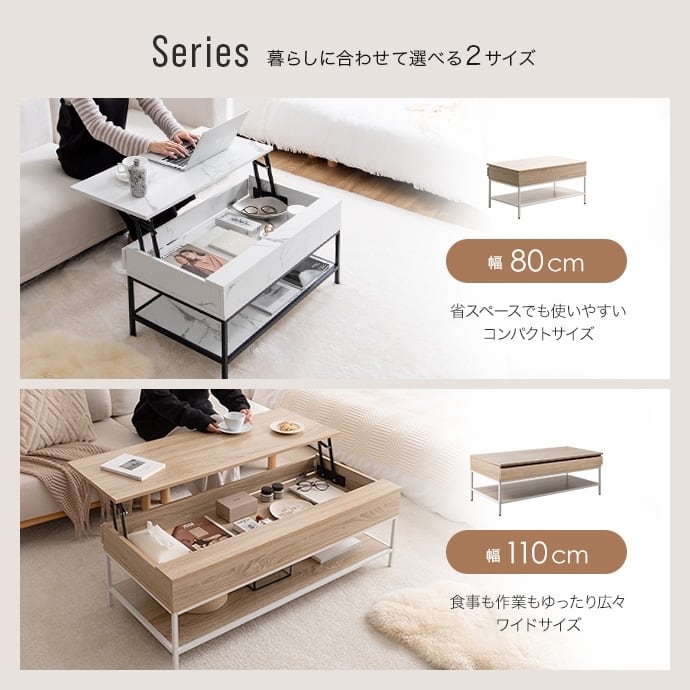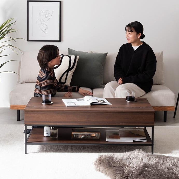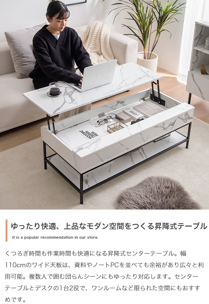 くつろぎ時間も作業時間も快適になる昇降式センターテーブル。幅110cmのワイド天板は、資料やノートPCを並べても余裕があり広々と利用可能。複数人で囲む団らんシーンにもゆったり対応します。センターテーブルとデスクの1台2役で、ワンルームなど限られた空間にもおすすめです。