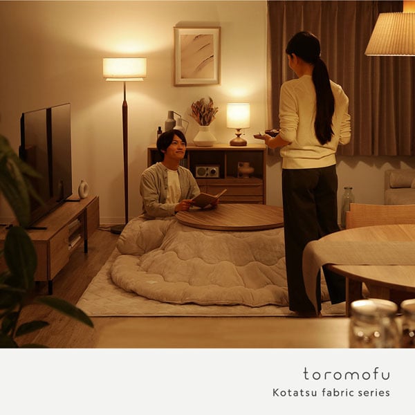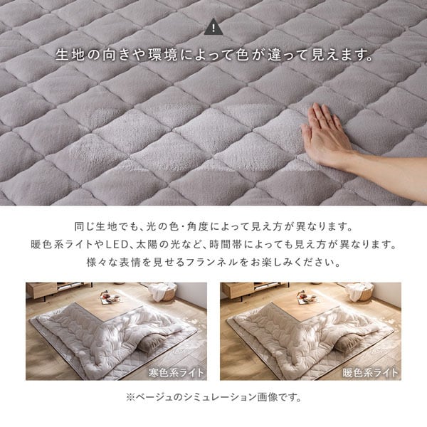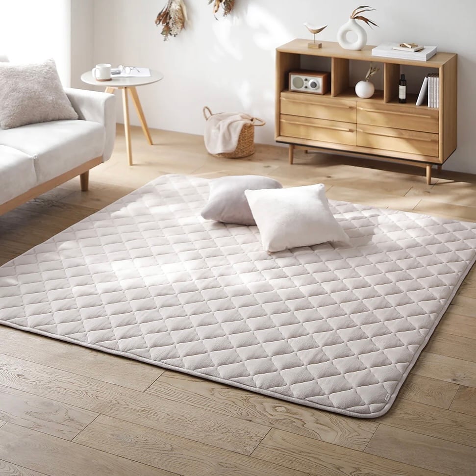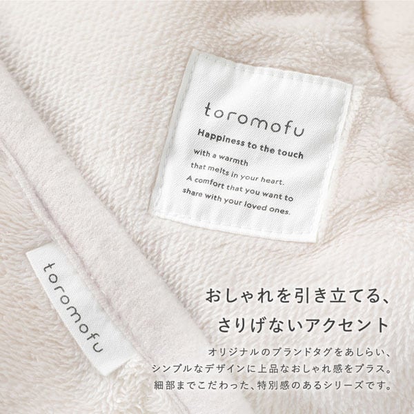 また、同じ素材を使用したこたつ掛け布団などもシリーズ展開しているため、組み合わせることで統一感のある空間コーディネートが完成します。さりげなくあしらったオリジナルのブランドタグが、シンプルなデザインの中に上品なアクセントを添え、細部までこだわりを感じられる一枚です。