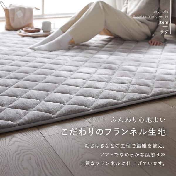 ふんわり心地よい肌触りにこだわった、上質なフランネル素材のラグです。工程ひとつひとつに丁寧に向き合い、繊維を何度もほぐし整えることで、ソフトでなめらかな質感に仕上げました。ふれるたびにほっとするやわらかさと、とろけるようなあたたかさが広がり、大切な人とシェアしたくなる心地よさを感じていただけます。