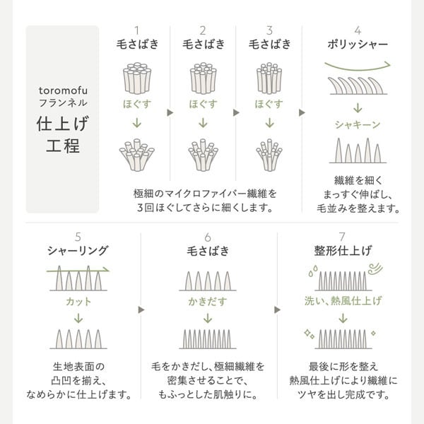 生地づくりでは、極細マイクロファイバー繊維を複数回ほぐし、ポリッシャーで毛並みを整え、シャーリングで表面をなめらかにカットするなど、丁寧な工程を重ねています。さらに毛をかき出して密集させることで、もふっとした贅沢な風合いを実現。最後に洗いと熱風仕上げを行い、ツヤのある美しいフランネルに仕上げています。