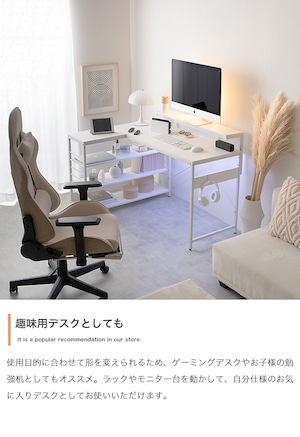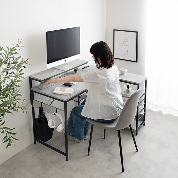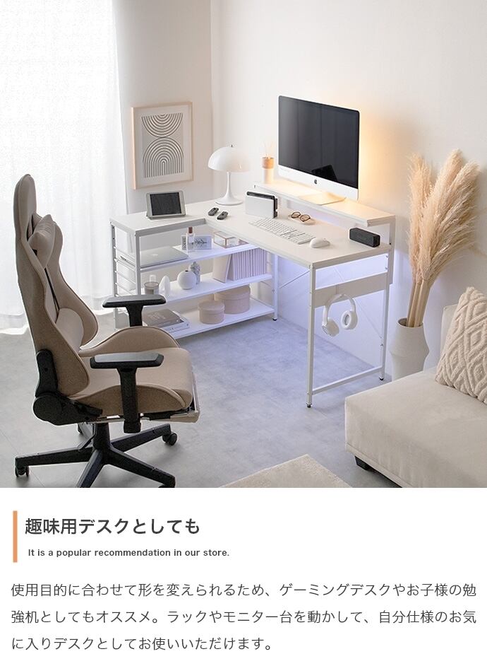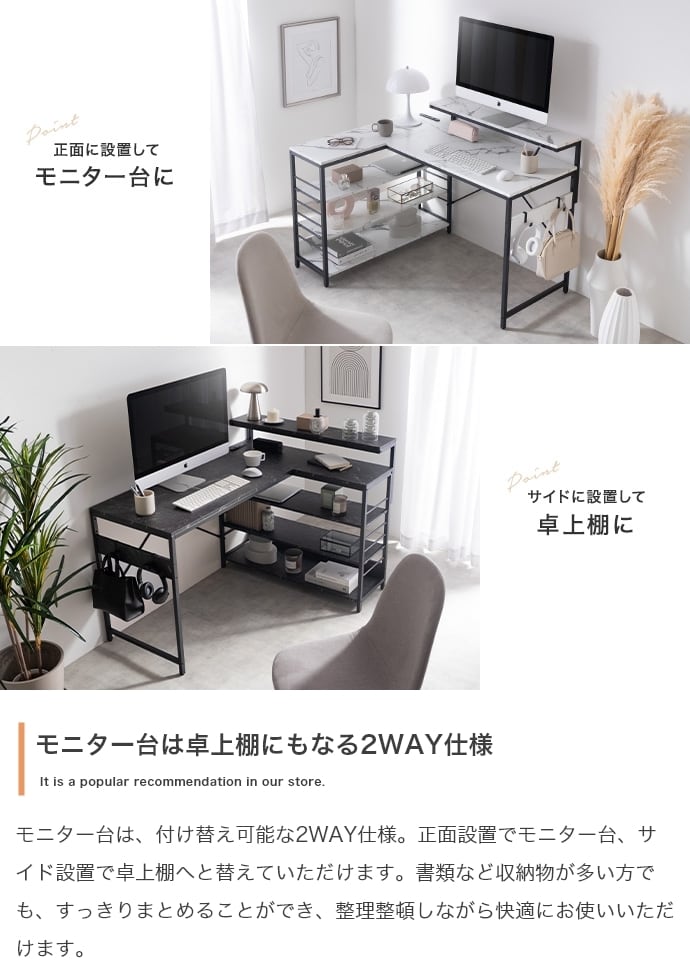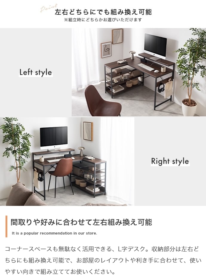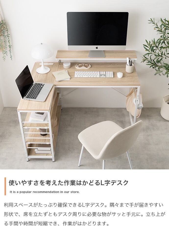デスク、モニター台、ラックが一体となったL字型デスク。広々とした天板は、パソコン作業しながら書類やノートを広げることが可能。モニター代、ラックは左右組み換えでき、好みの向きに合わせてご使用いただけます。また、嬉しいUSB・コンセント付き。その場にいながら充電や給電をしていただけます。効率的に作業を進められる「使い勝手」にこだわった設計です。