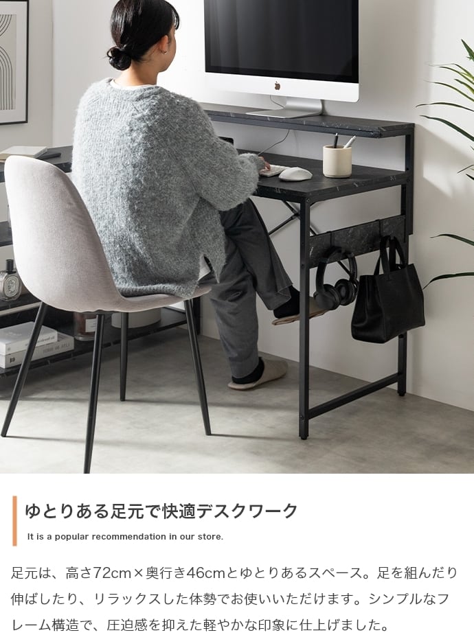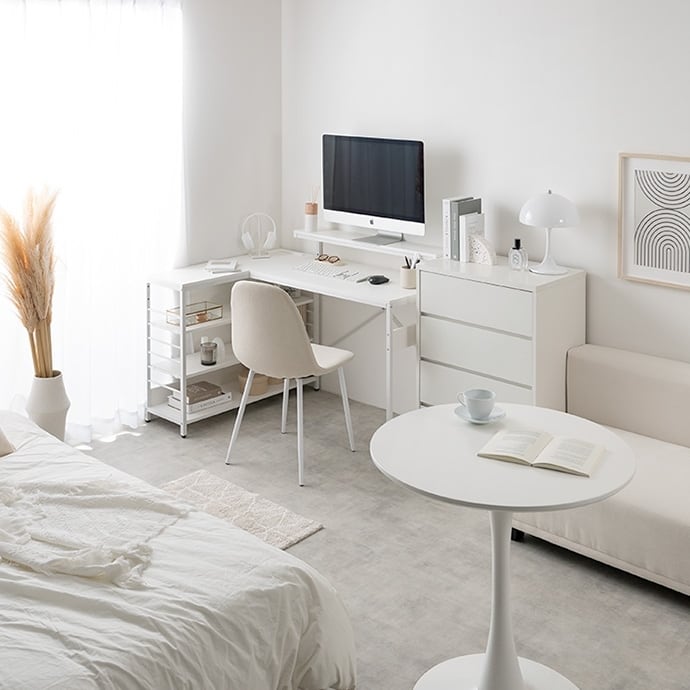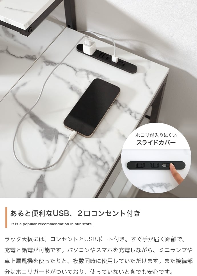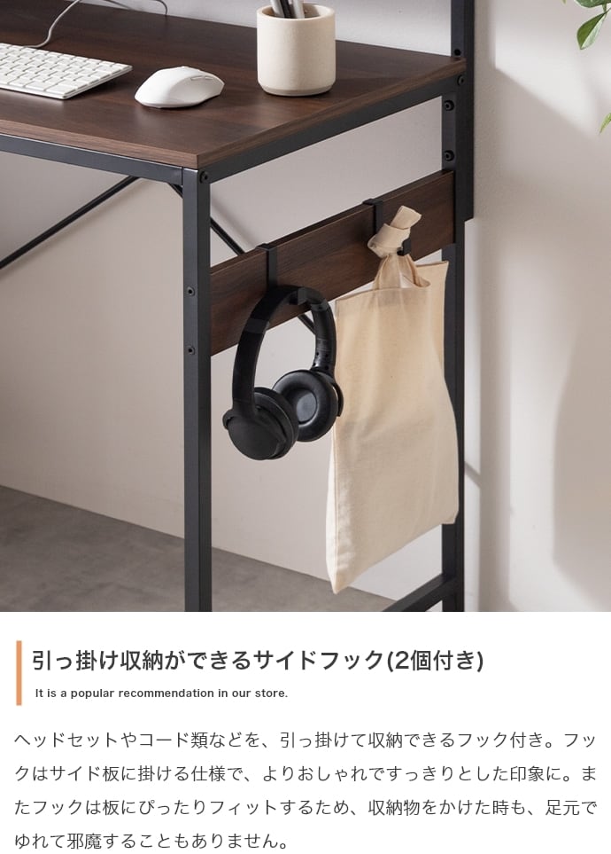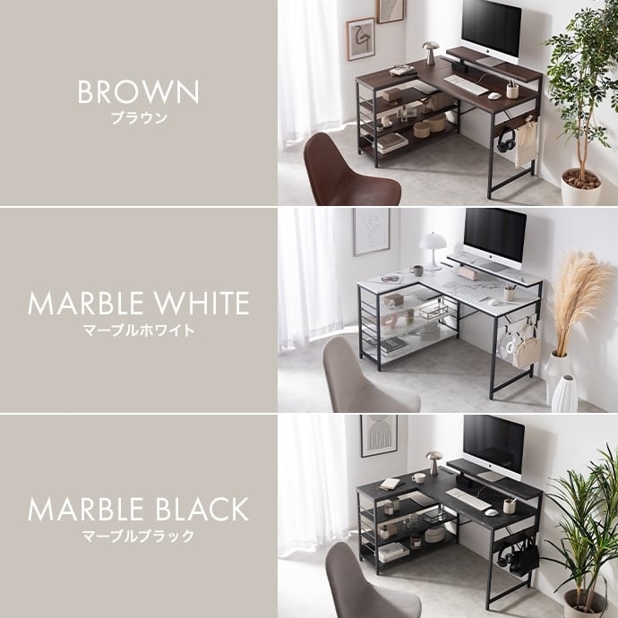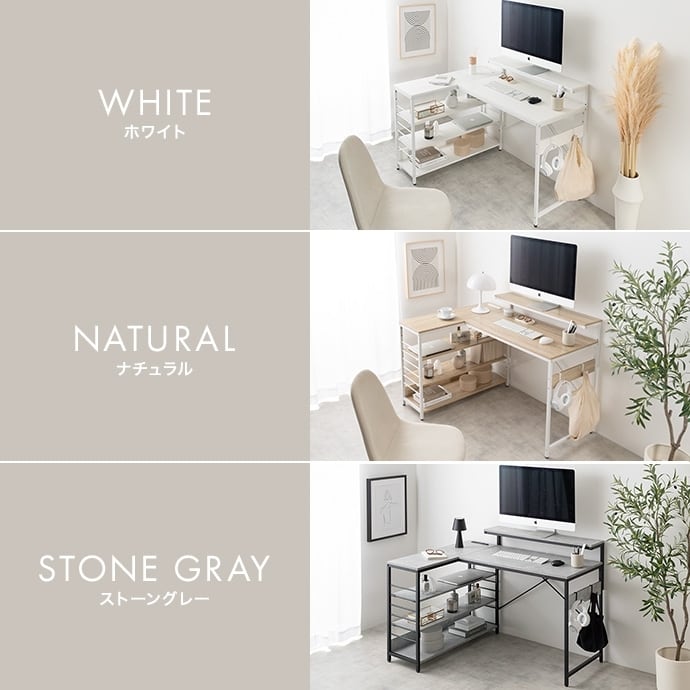 デスク、モニター台、ラックが一体となったL字型デスク。広々とした天板は、パソコン作業しながら書類やノートを広げることが可能。モニター代、ラックは左右組み換えでき、好みの向きに合わせてご使用いただけます。また、嬉しいUSB・コンセント付き。その場にいながら充電や給電をしていただけます。効率的に作業を進められる「使い勝手」にこだわった設計です。