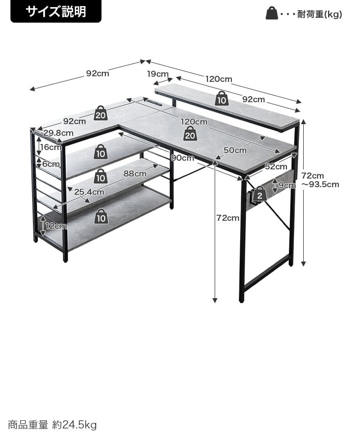 天板:約20kg 、モニター台:約10kg、ラック天板:約20kg